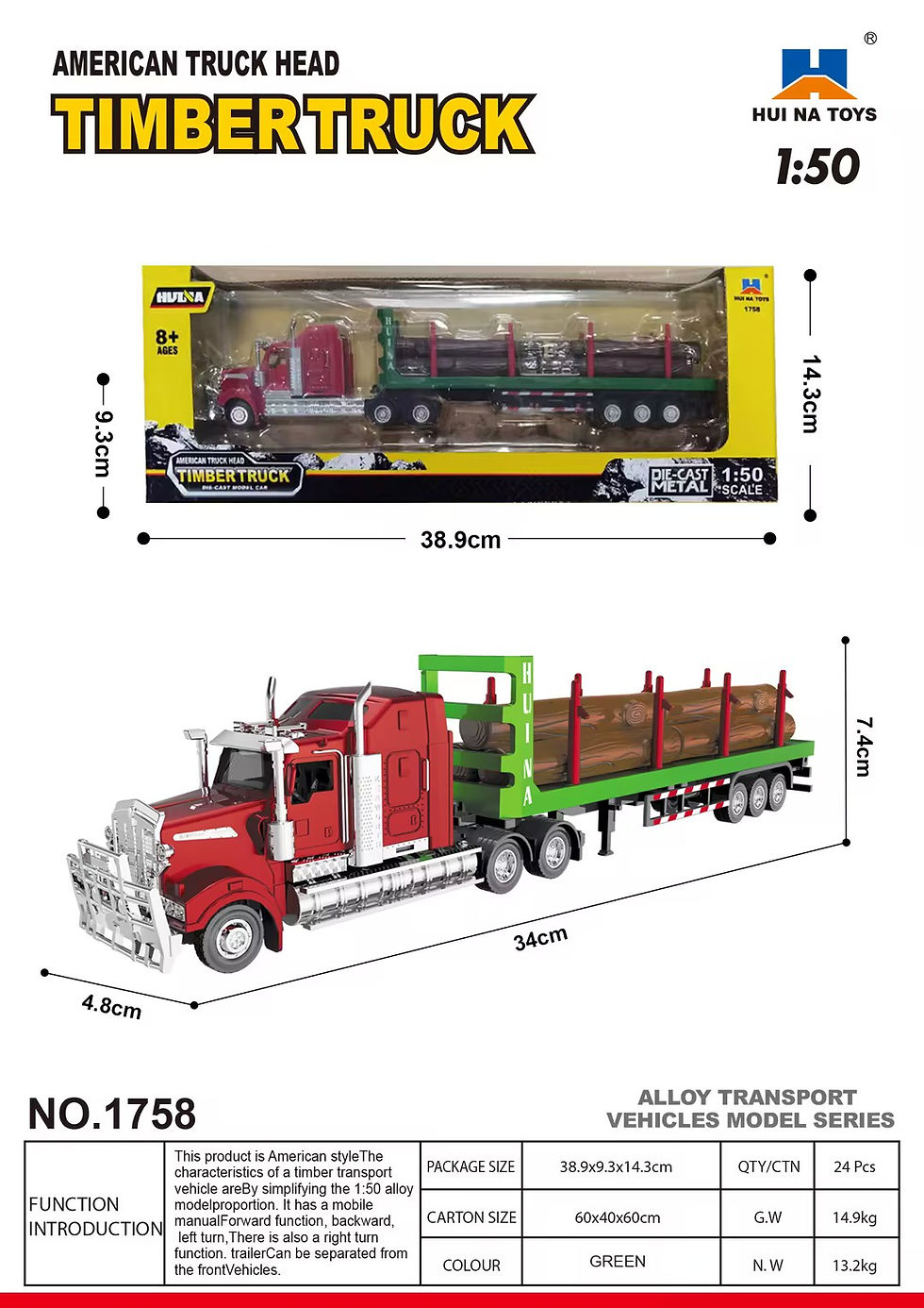 The Huina 1758 Timber Truck is a realistic 1:50 scale die-cast logging transporter, designed in classic American truck style. With its detachable trailer, included timber logs, chrome cab detailing, and smooth rolling wheels, this model is ideal for kids aged 8+ and collectors who enjoy forestry and transport vehicles.